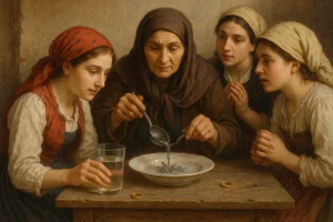 There were different ways to obtain a sign, such as putting their rings in a glass of water and having it read according to its movement, also the shapes formed by melted lead or the white of an egg when put in water. The fortune teller was always female and usually old by the time she had enough experience to “foretell” the future. Reading the signs she could tell who would get married first, the financial situation of the future husband and sometimes even his name! At noon every unmarried girl would go down to the main well. Counting out forty buckets, she would throw the water of each bucket over her shoulder, while at the same time her eyes were fixed on a mirror that was placed on the well, where she would see her future husband.
